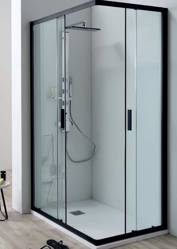 BOX PORTA SCORREVOLE LINEA 2000 SERIE RAPID TELAIO NERO MAT 125/130 CRISTALLO TRAPARENTE MM. 6 TRATTAMENTO ANTIGOCCIA DI SERIE