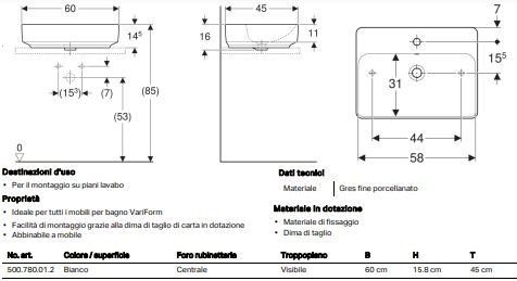 Lavabo simmetrico Variform cm. 60 x 45 GEBERIT
