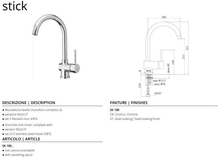 MISCELATORE LAVELLO STICK PAFFONI CROMO SK180
